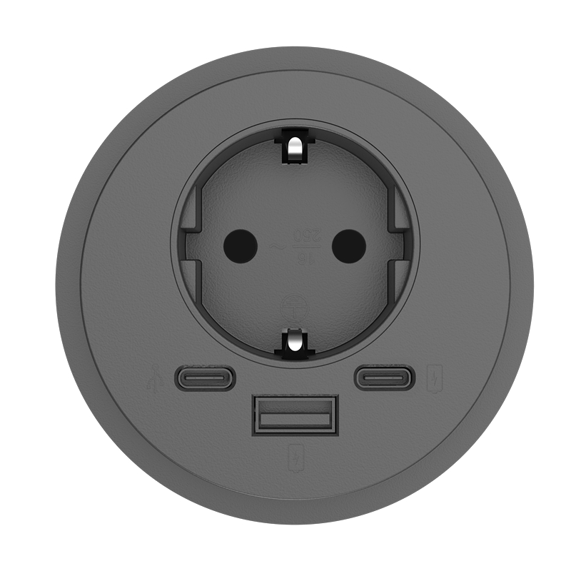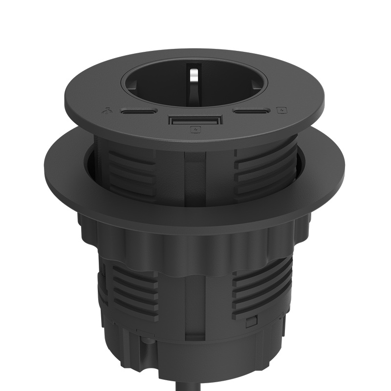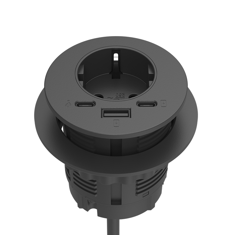 Utstyrt med 1 x 230V tilkobling, 1 x USB-A/C lader og 1 x USB-C dataforlengelse.