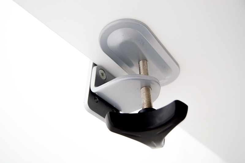 Klemmefeste klarer å ta bordplater opptil 60 mm. Skjermfeste sin bakside går ut 7 mm. fra bordplaten mot vegg.